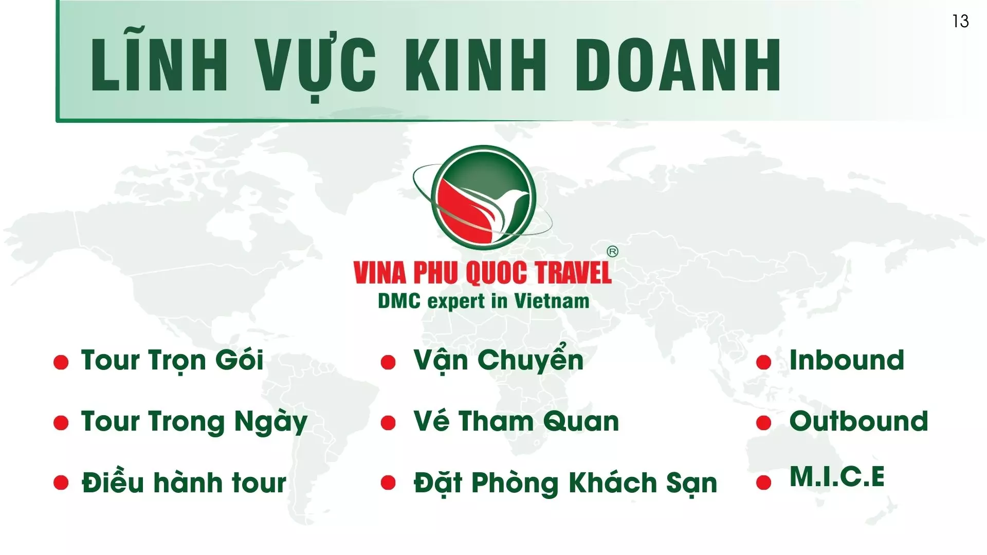 Hoạt động nhiều năm tại Phú Quốc, Vina Phu Quoc Travel tập trung phát triển các sản phẩm inbound, MICE, tour đoàn và dịch vụ du lịch cao cấp, phục vụ đa dạng thị trường khách quốc tế. Doanh nghiệp từng bước mở rộng hợp tác với các buyer, hãng lữ hành và đối tác quốc tế trong quá trình xây dựng và triển khai các chương trình du lịch tại Phú Quốc.